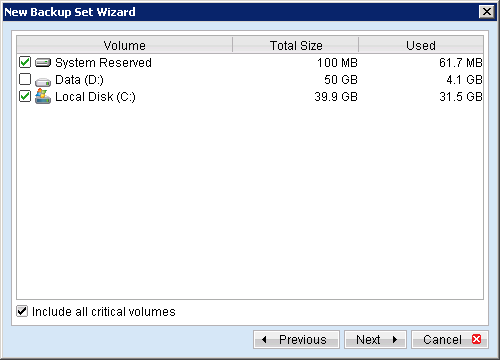 For complete backup of the system, it is recommended to select the [Include all critical volumes] option.